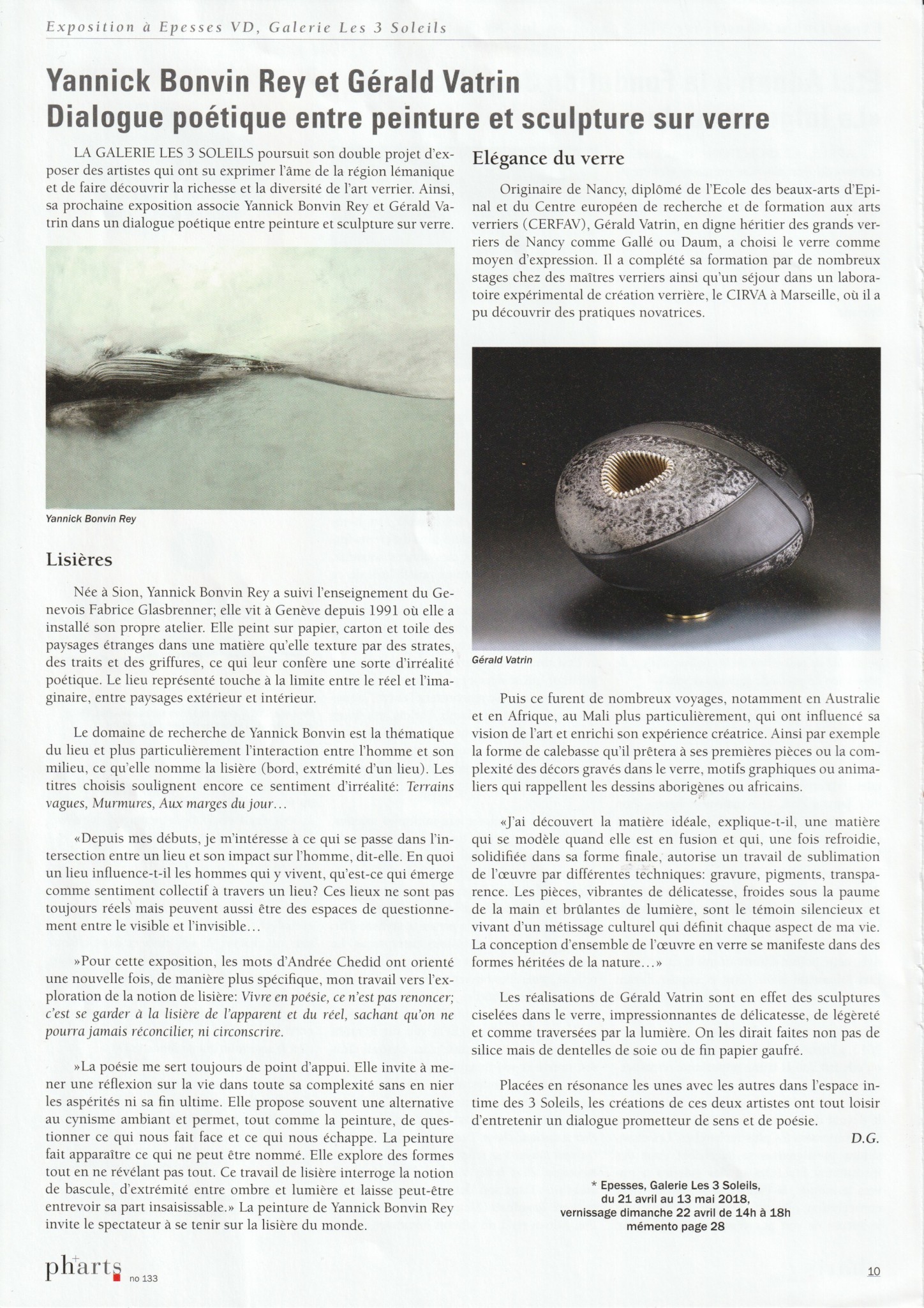 Galerie Les 3 soleils / EpessesExposition du 21 avril au 13 mai. Vernissage dimanche 22 avril de 14h00 à18h00